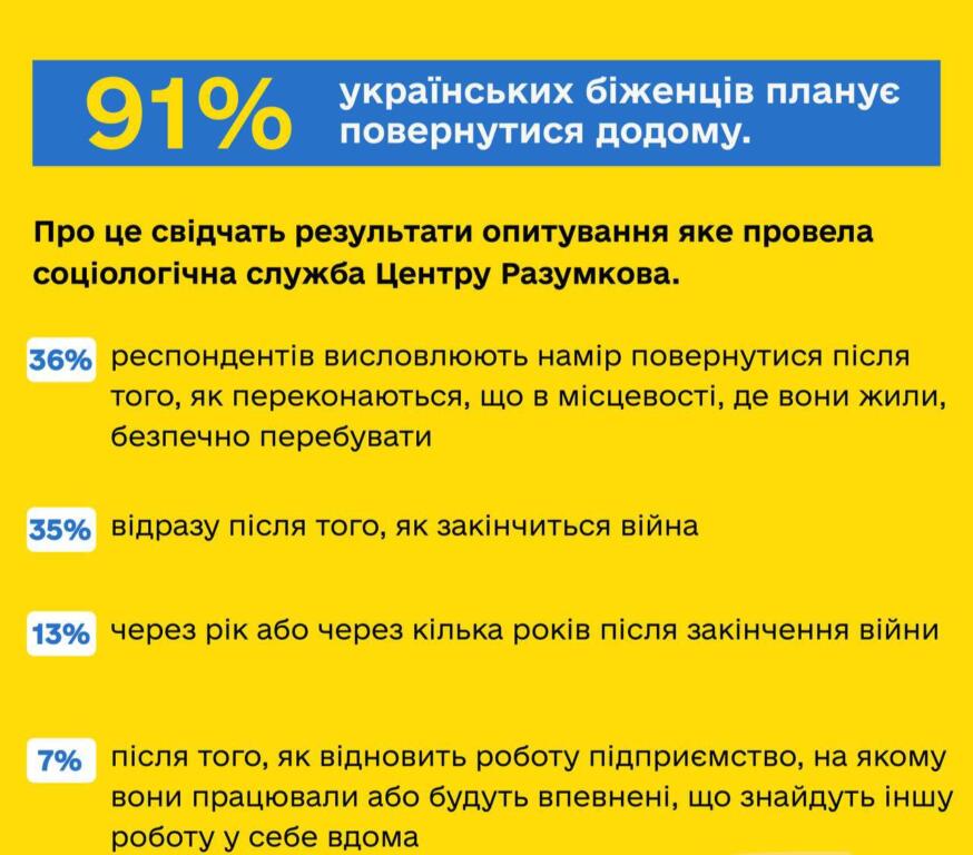 Такі дані надала соціологічна служба Центру Разумкова, вони провели опитування серед українських біженців, які втікли з України до інших країн. За даними опитування, 91% українців планує повернутися додому.