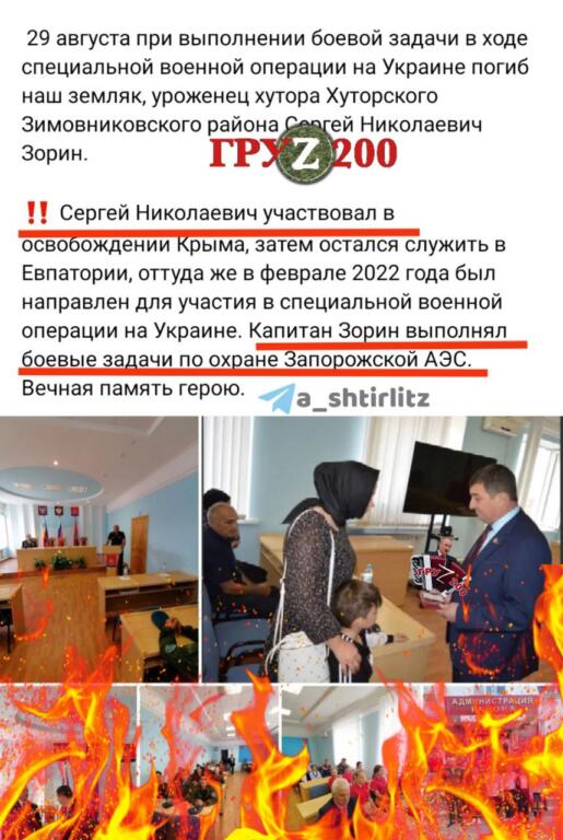 29 серпня в Україні загинув капітан Росгвардії Сергій Миколайович Зорін, який у 2014-му брав участь у захопленні Криму, а цьогоріч «охороняв» Запорізьку АЕС.