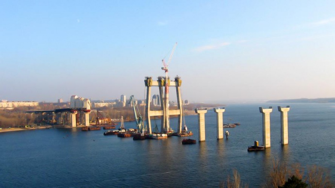 Несмотря на сильные морозы и выпавший снег, на строительной площадке в районе Кривой бухты кипит работа по укрупнению секций пролетного строения для верховой стороны вантового моста – на самой главной сооружения автотранспортной магистрали через Днепр в Запорожье.