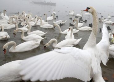 В Приморске на побережье Азовского моря отдыхающие заметили целую стаю лебедей.