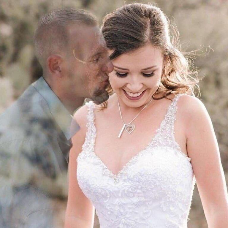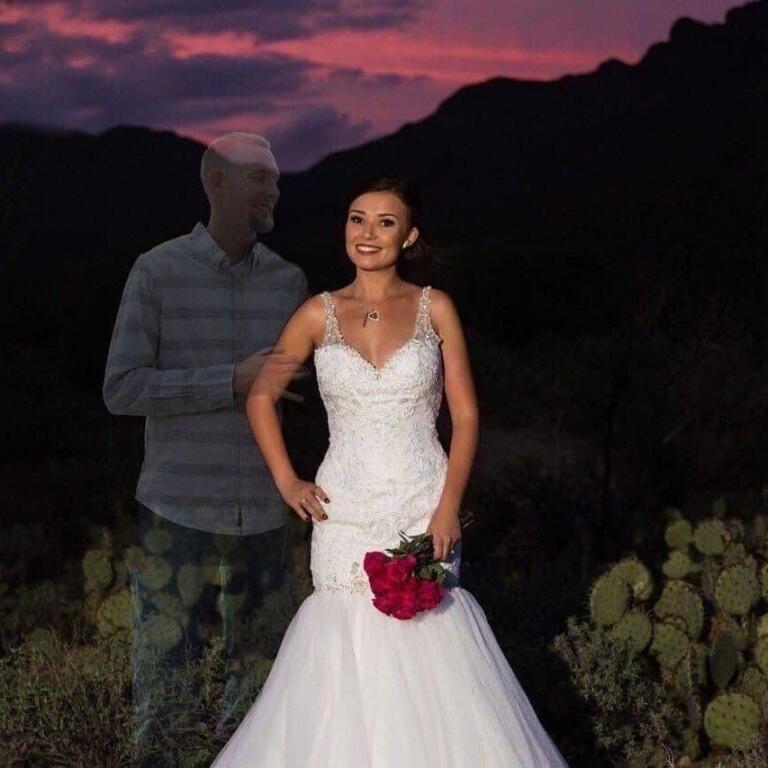 Как сообщает Fox News, девушка придумала для свадебной фотосессии необычную концепцию. Воплотить идею помогла фотограф Кристи Фонсека. Она запечатлела Дебби в свадебном платье, а затем, использовав старые снимки, совместила их с Рэнди, но так, чтобы фотографии отражали трагичность ситуации – мужчина сделан полупризрачным.