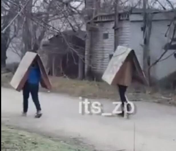 По одной из улиц в Шевченковском районе шли два “фиксика”. Которые несли на голове видимо матрасы. На видео не сильно понятно что это именно. Мы предполагаем еще один вариант – крыша для будки.