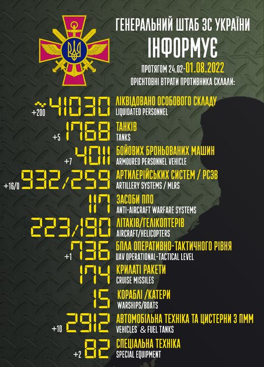 Загальні бойові втрати противника з 24.02 по 01.08 орієнтовно склали / The total combat losses of the enemy from 24.02 to 01.08 were approximately: