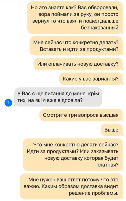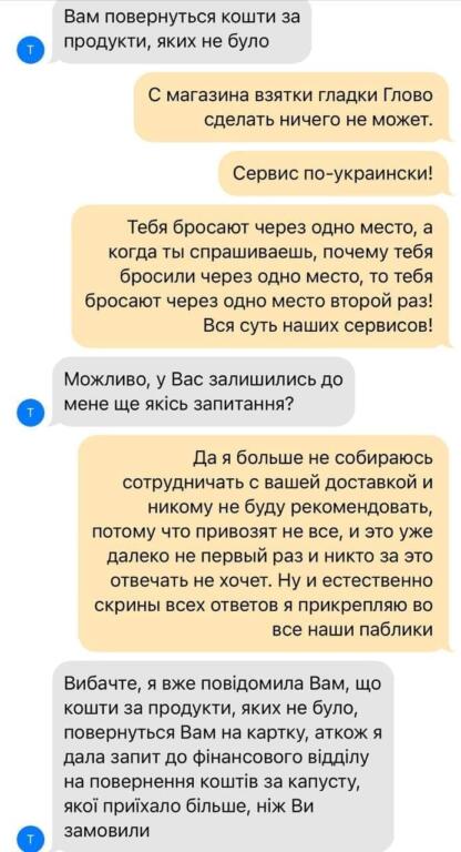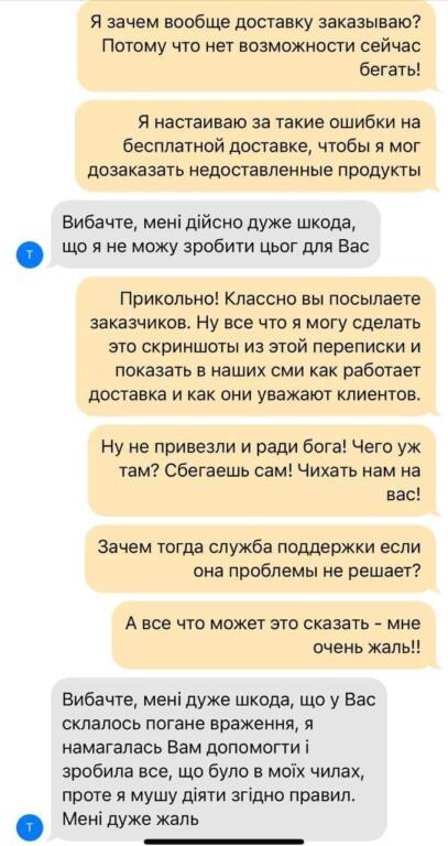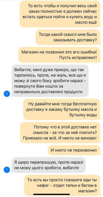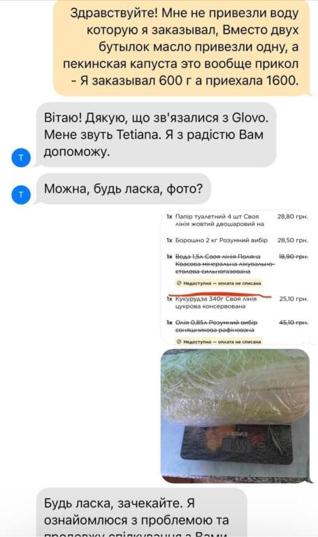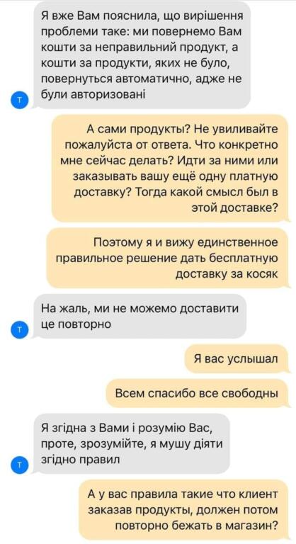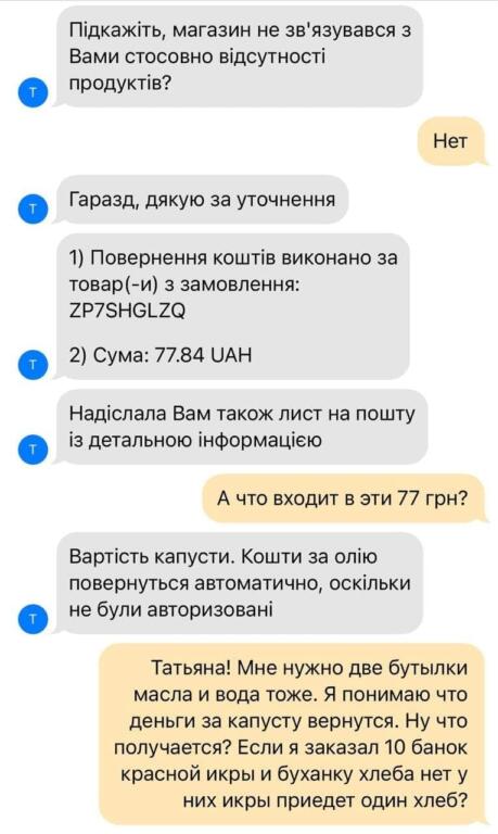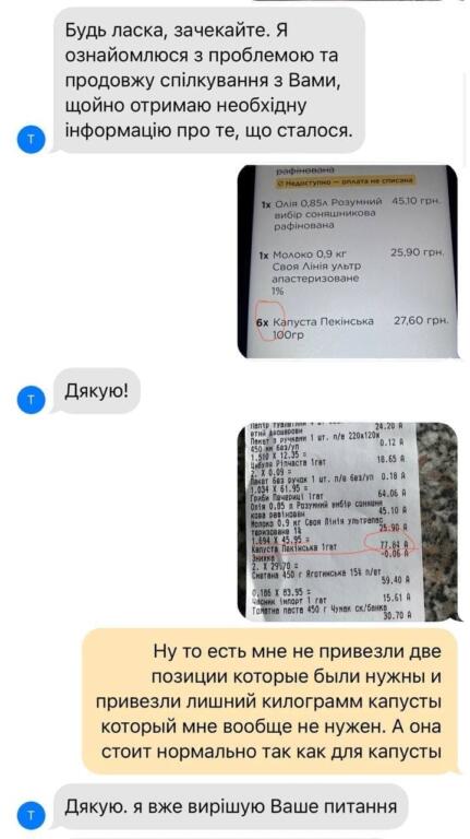 “Заказываю доставку, не приезжает два продукта, а пекинской капусты приезжает на 1 килограмм больше, чем было заказано. В техподдержке сказали, за лишнюю капусту деньги вернутся, а вот то, что не привезли – если хотите идите в магазин или заказывайте повторную платную доставку. А какой смысл тогда в этой доставке был?”, – пишет пользователь и прилагает скриншоты переписки.