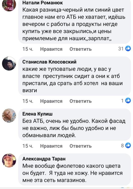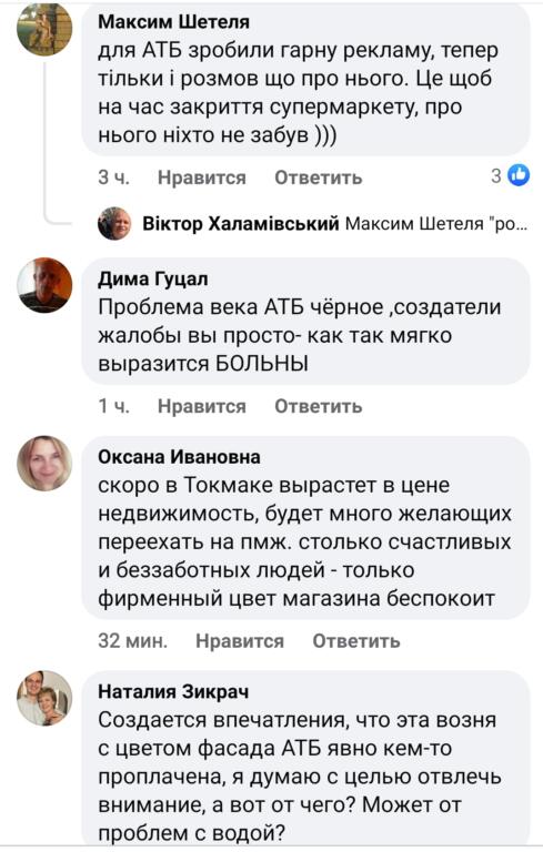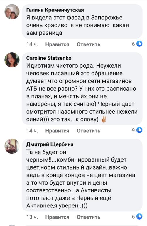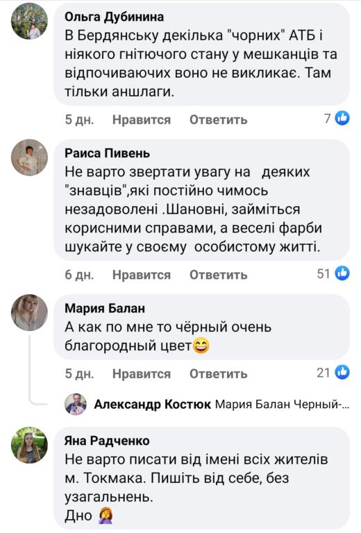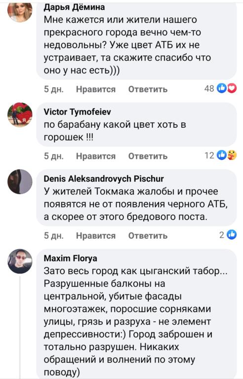 Вместе с тем, как выяснил Пресс-центр не так уже и много жителей Токмака высказываются против “черного” АТБ. В основном в комментариях к публикациям о так называемом протесте, токмачане пишут о том, что считают такой редизайн стильным, а некоторым вообще безразличен цвет, лишь бы в магазине был необходимый товар по адекватным ценам.