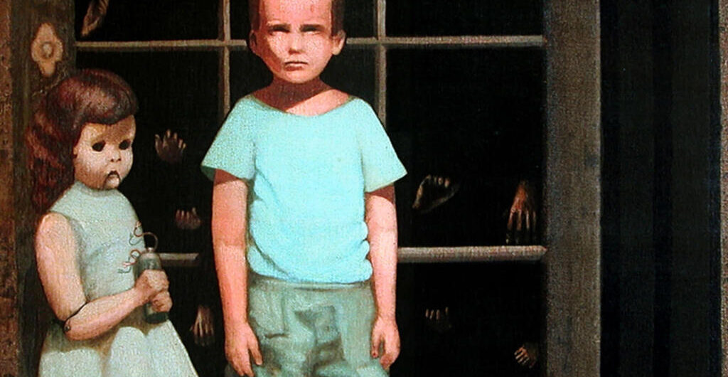 Картина, написанная в обычной реалистической манере, пугает своей постепенно раскрывающейся неестественностью. Что, например, происходит с головой мальчика? Из-за слишком резкой тени, падающей на его шею и плечо, издалека может показаться, что она вовсе отделена от тела. Но при ближайшем рассмотрении, напротив, кажется совершенно плоской. Глаза ребенка – разве это глаза живого человека? На совершенно безжизненном лице мальчика они выглядят как жуткие прорези, через которые можно увидеть темный фон двери. Девочку с фотографии художник сделал куклой – с еще более пустыми и безжизненными провалами глаз и шарнирными частями тел. Девочка сжимает в руке какой-то странный предмет – может быть, это батарейка, которую надо заменить, чтобы кукла ожила? Не меньшую тревогу вызывают и те самые «сопротивляющиеся» руки по ту сторону двери.