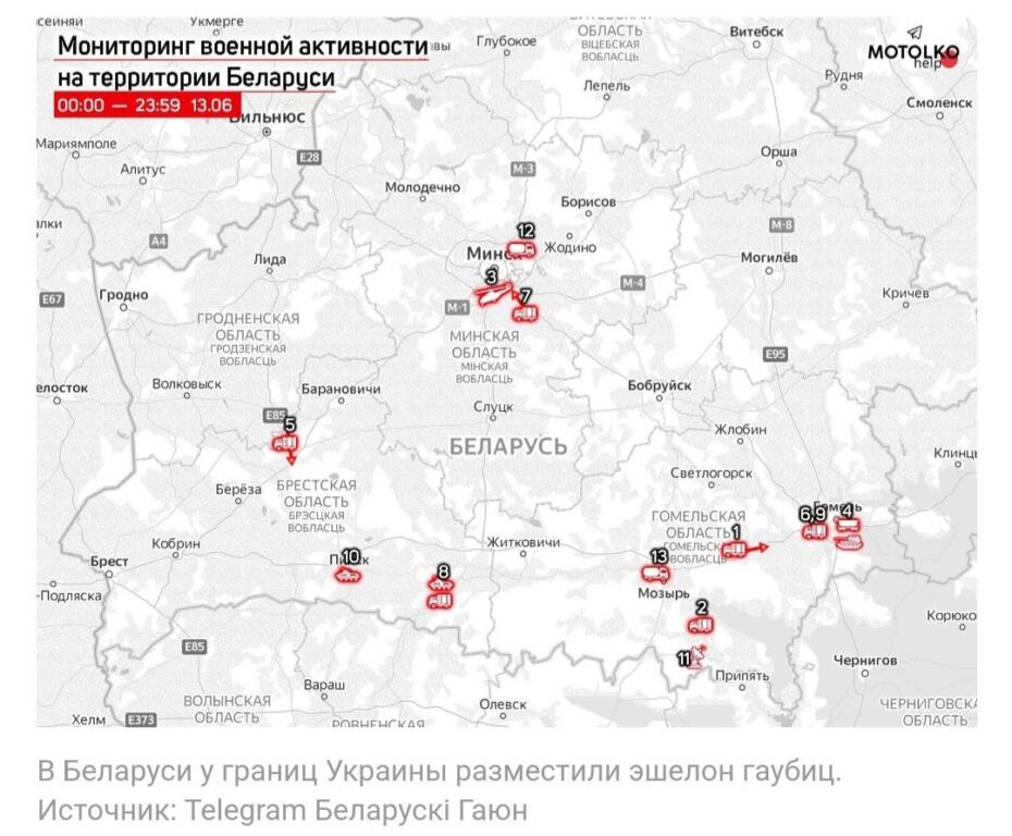 “На станции в Гомеле – стоял эшелон с гаубицами. Среди эшелона замечены все новые с тканью на конце дула. Также 2 цельнометаллических вагона. 14:30 Гомель, район Новобилицы в сторону Жабров двигались эти же САУ”, – говорится в сообщении.