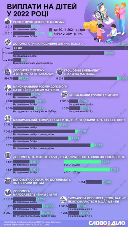 Изменение прожиточного минимума в Украине автоматически тянет за собой изменение размера социальных выплат, в том числе на детей. Следующее повышение ПМ, если верить проекту госбюджета-2022, запланировано на июль. Значит, размер выплат на детей «зафиксирован» более чем на полгода.