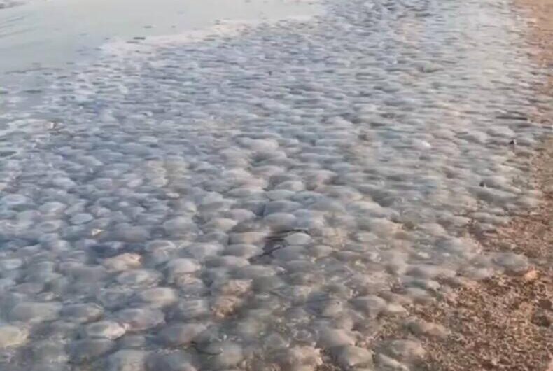 Нашествие медуз не прекращается, в сети показали очередной видеоролик с запорожского курорта. Приморский Посад с высоты птичьего полета, где все заполонили медузы.