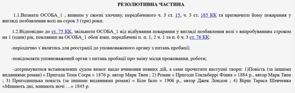 Как сообщает «Думская», судья обязал приговоренных прочесть «Приключения Тома Сойера» и «Приключения Гекльберри Финна» Марка Твена, «Белый Клык» Джека Лондона, а также стихотворение «Минають дні, минають ночі» Тараса Шевченко.