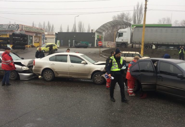 Как стало известно, автомобиль Volkswagen врезался Skoda Fabia, после чего в VW влетела Skoda Octavia, а в нее по иннервации — Daewoo Lanos.
