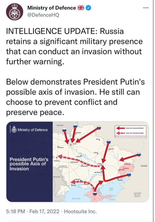 Минобороны Британии решило составить конкуренцию газете Bild и опубликовало свою карту российского вторжения в Украину.