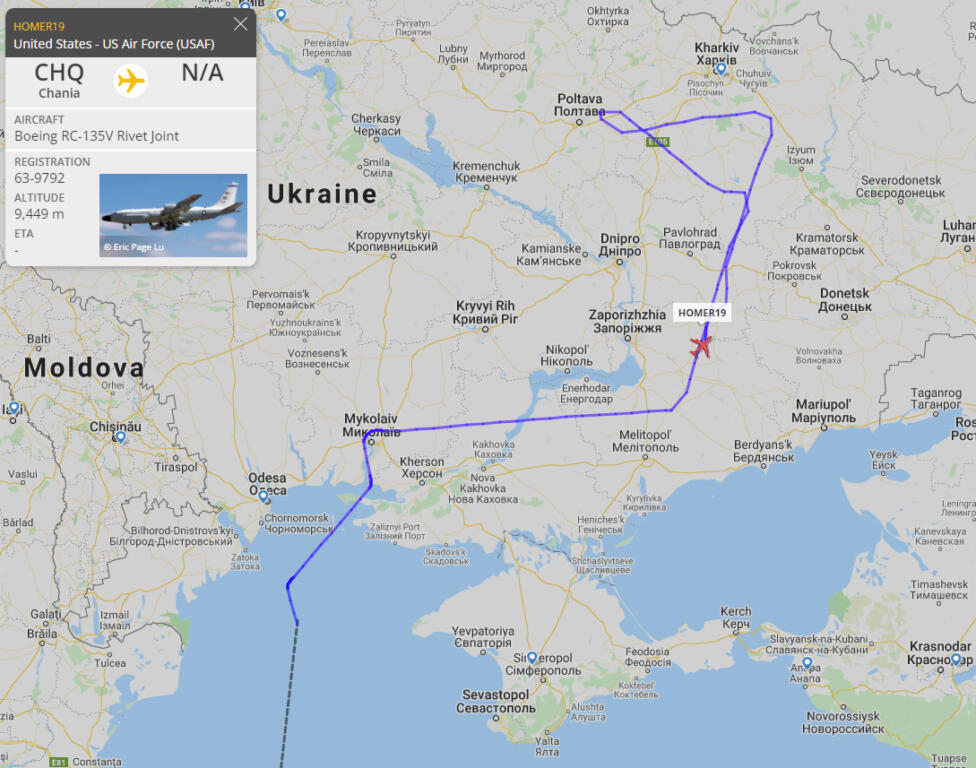 Уже около 9 часов утра, после дозаправки над Черным морем, американский разведчик приступил к полету над Украиной по маршруту: Николаев – Мелитополь – Краматорск – Изюм – Полтава.