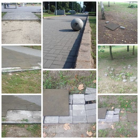 На территории парка разобрали дорожку, на паркуре сняли мягкое покрытие. Все разбросано по парку. Снятой плиткой и покрытием заложена ливневка.
