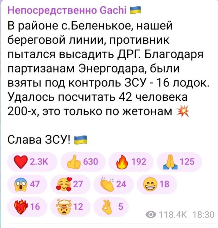 Завдяки партизанам Енергодару було ЗСУ змогли взяти під контроль 16 ворожих човнів. Щонайменш 42 російських військових загинуло, згідно зі знайденими жетонами.