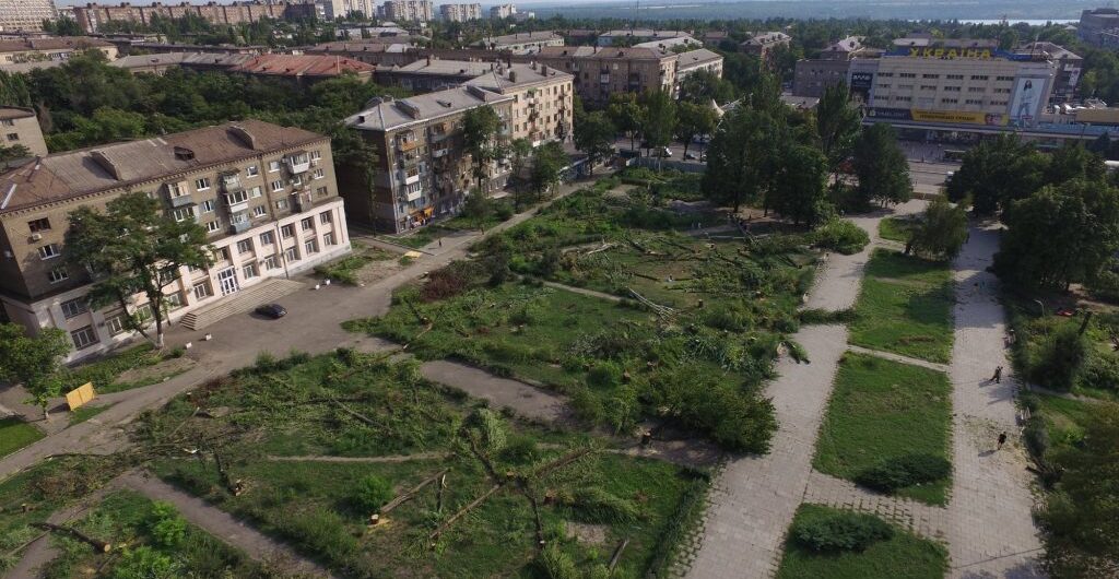 История уничтожения сквера имени Яланского длится непростительно долго – целых три года, когда в августе 2018-го здесь среди бела дня по поручению известного в Запорожье бизнесмена нанятые рабочие спилили несколько сотен деревьев, расчищая участок под строительство торгово-развлекательного центра. Пилили спешно, стволы деревьев падали на лавочки, подминая под себя урны, фонари и остатки цветов. Среди этого начавшегося хаоса деловито сновали некие молодые люди в спортивных костюмах.
