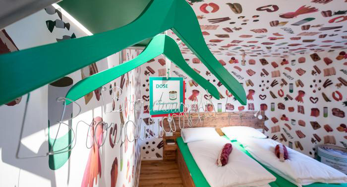 В отеле, который с юмором называет адом для вегетарианцев, всего семь номеров и все они оформлены именно в колбасном стиле. Большие ножи, блестящие отполированными лезвиями, висят на стенах, указывая посетителям путь к нужному гостиничному номеру. Стены и потолки в комнатах обклеены обоями, узор на которых образует череда батонов или ломтиков колбасы, сосисок, кусков грудинки, ветчины и прочее.