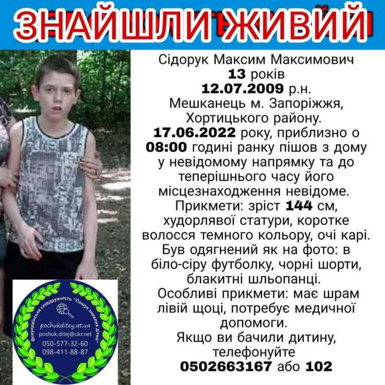 В Запоріжжі розшукувався 13-річний Сідорук Максим Максимович.