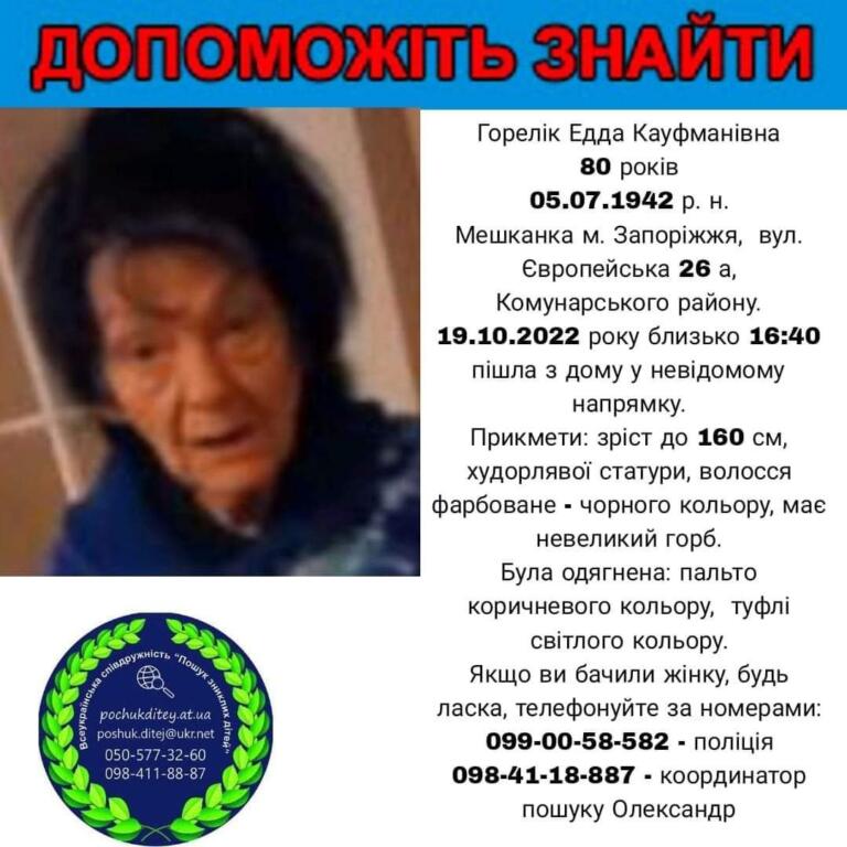У Запоріжжі розшукується Горелік Едда Кауфманівна, 1942 року народження.