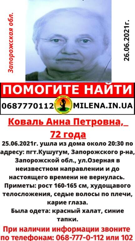 Так, Коваль Анна Петровна ушла из дома в пгт Кушугум и пропала.