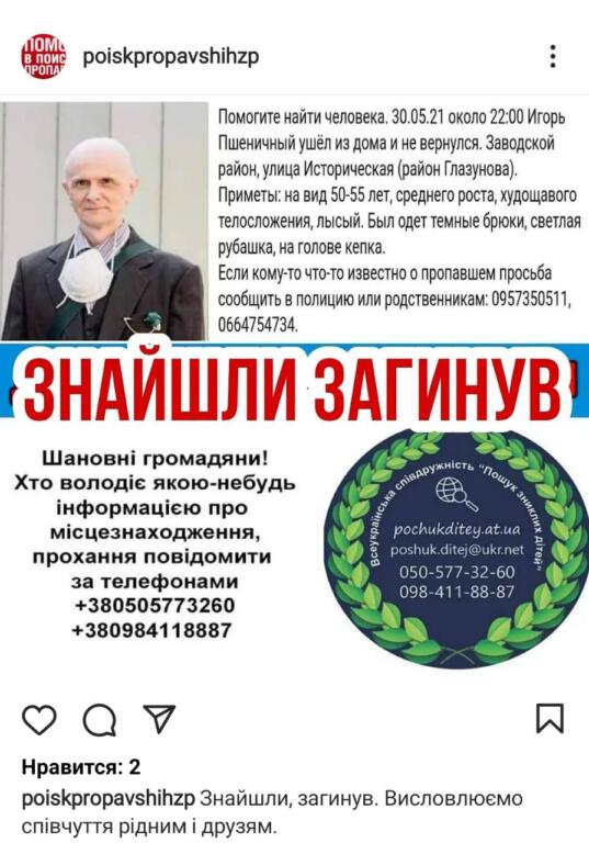 Как сообщили в Общественной организации «Всеукраинское содружество» Поиск пропавших детей», поиски мужчины остановлены. К сожалению, он умер. Подробности случившегося пока неизвестны.