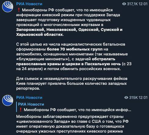 Пропагандистское издание «РИА» якобы предупреждает о том, что «ВСУ готовятся совершать ужасные провокации и обвинить потом в этом РФ».
