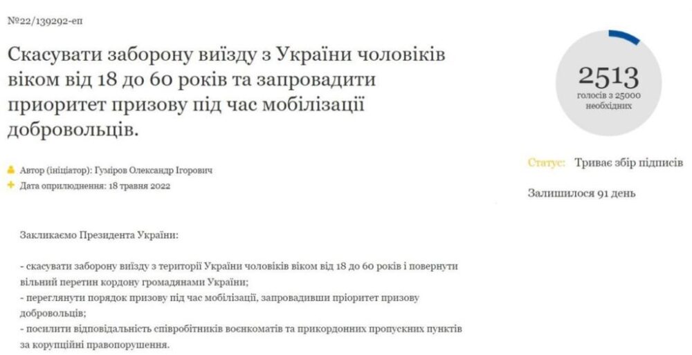 Автор петиции делает акцент на том, что подобный запрет «плодит коррупцию» и предлагают делать упор на добровольцев во время мобилизации.