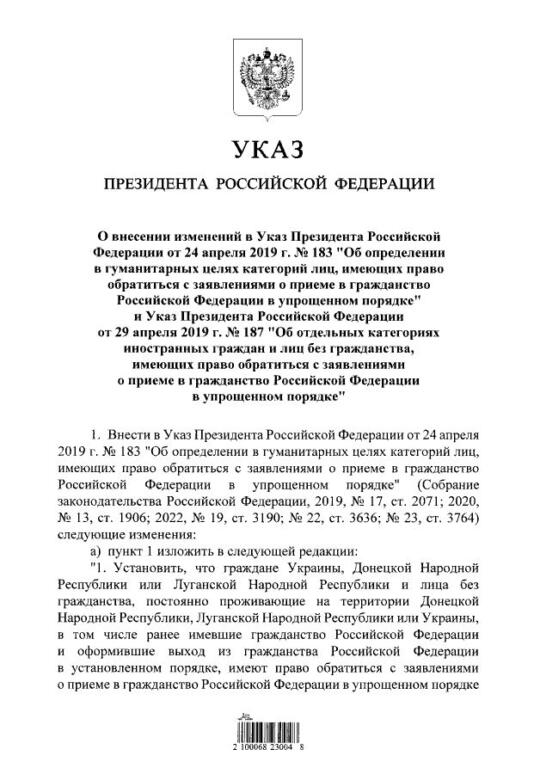 “Встановити, що громадяни України, Донецької народної республіки та Луганської народної республіки та особи без громадянства, які постійно проживають на території Донецької народної республіки, Луганської народної республіки чи України… мають право звернутися із заявами про прийом до громадянства Російської Федерації у спрощеному порядку”.
