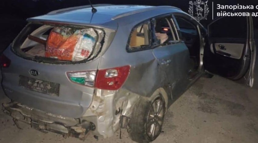 Керівник Запорізької ОВА Іван Федоров: “Ворожий обстріл — жінка поранена, авто пошкоджене. Надали допомогу”. Поліція розслідує як воєнний злочин (ст. 438 ККУ). Фото: пошкоджене авто з уламками, сліди дрона.