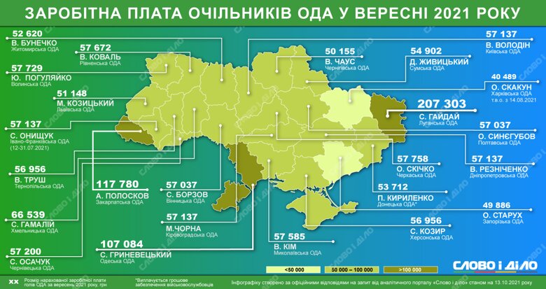 Наименьшую зарплату за сентябрь насчитали главе Запорожской ОГА Александру Старуху (49 886 грн), меньше заработал лишь руководитель Харьковской ОГА – исполняющему обязанности Александру Скакуну (40 489 грн).