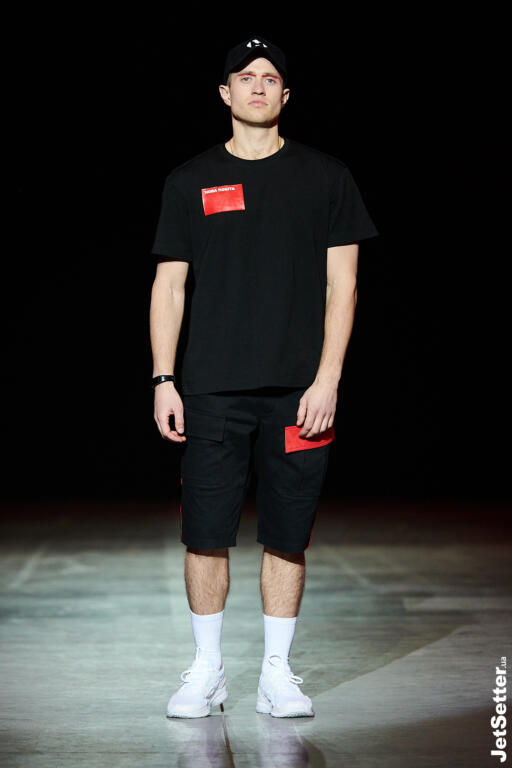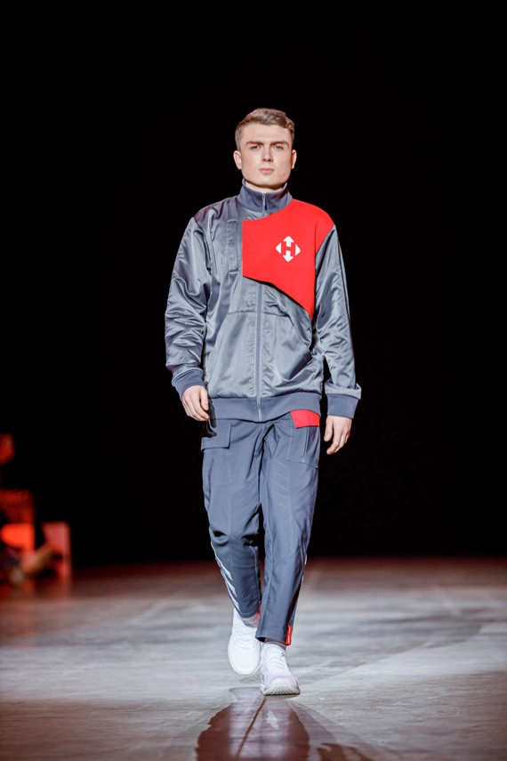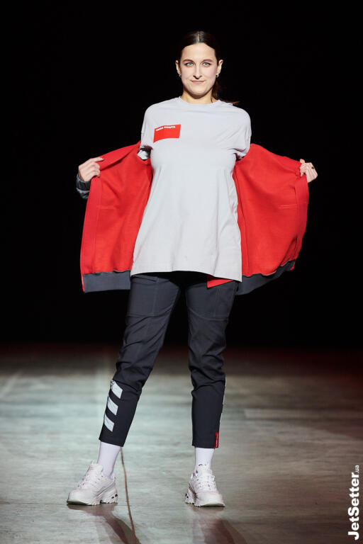 В линейке преобладают свободные силуэты и натуральные ткани. Была использованы такие цвета, как красный, черный, белый и серый цвета. Также в одежде используют светоотражающую ткань.