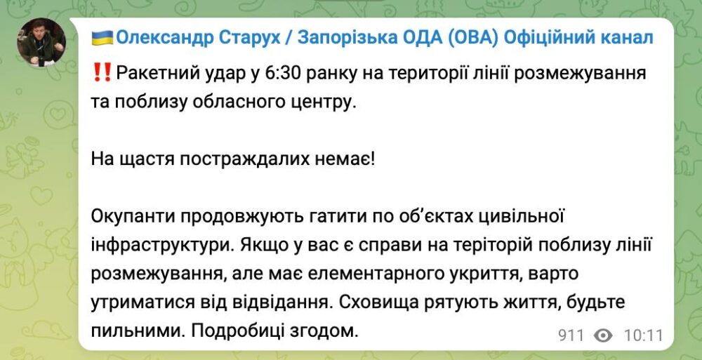 – Ракетний удар по лінії розмежування, та поблизу областного центру. Постраждалих нема, – каже голова ЗОВА Олександр Старух.