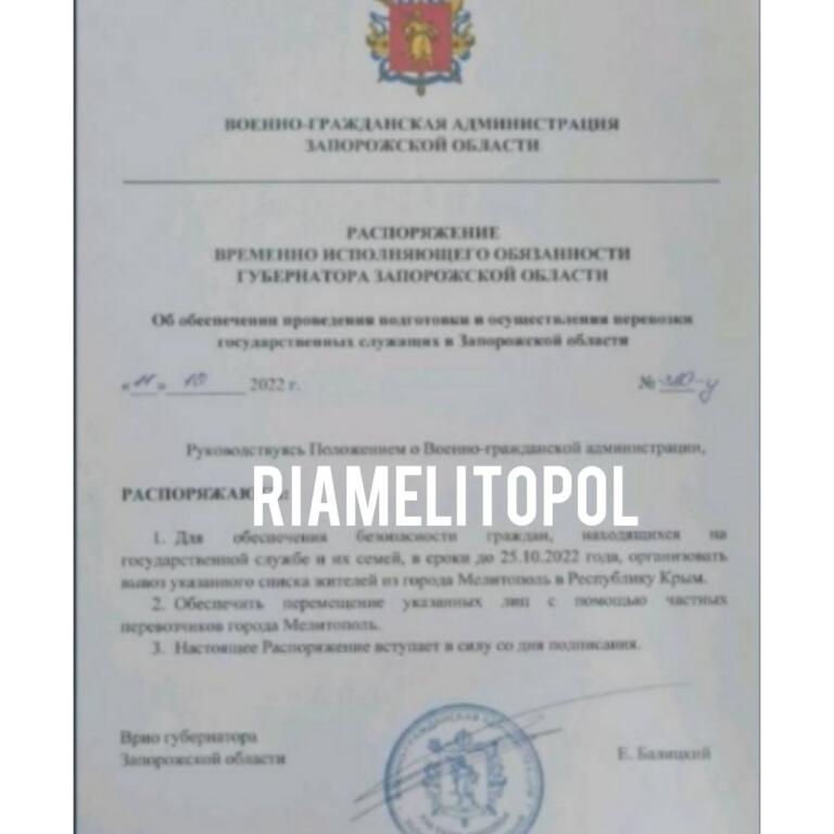 Так, гауляйтер Запорізької області Євгеній Балицький підписав розпорядження про підготовку евакуації представників окупаційної влади та членів їх сімей.