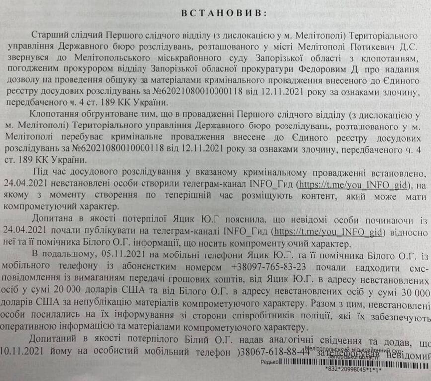 Отмечается, что ранее вымогатели уже подобным образом обогащались на других жертвах, но Яцык и ее помощник отказалась платить и обратились в полицию. Киберполиция быстро вычислила мошенников, и сотрудники Управления стратегических расследований пришли с обысками к преступникаи. Полицейские изъяли офисную технику с доказательной базой.
