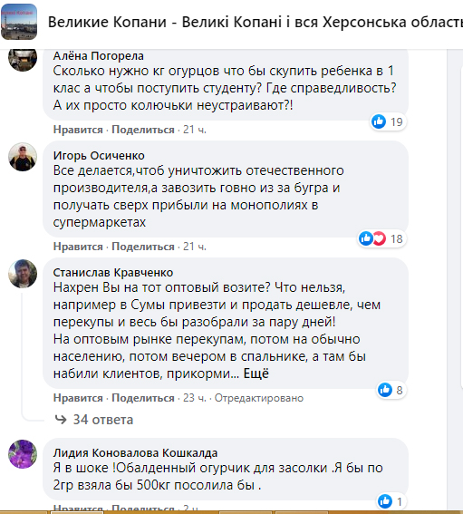 Как рассказал фермер, оптовые покупатели отказались приобретать овощи даже по 1 грн за кг. при этом, более презентабельного вида овощи “с нормальной колючкой и цветочком” покупают по 2 грн.
