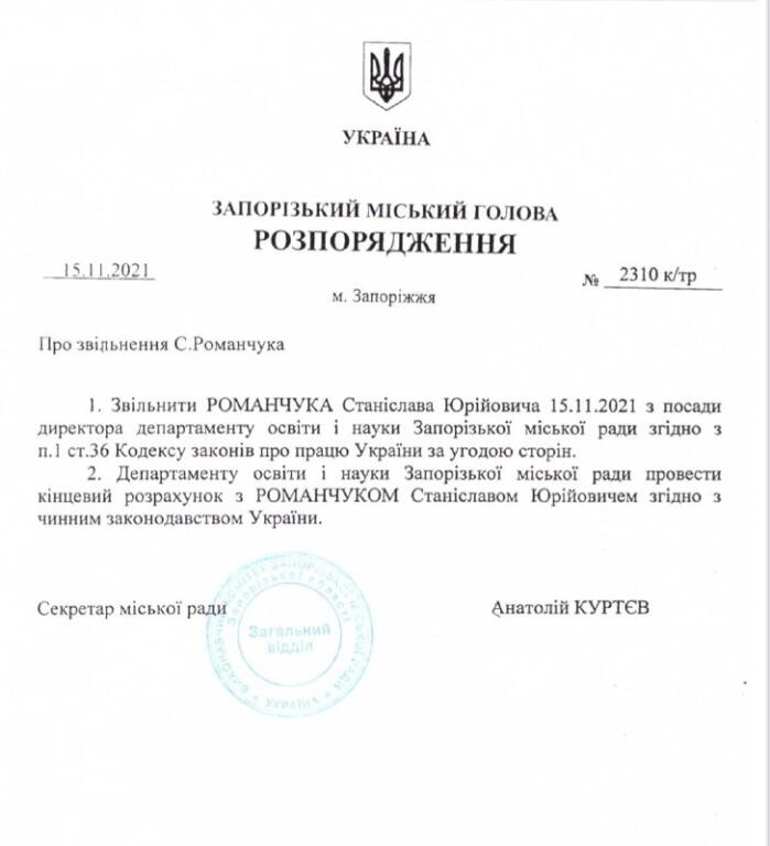 Станислав Романчук ушел с должности директора департамента образования и науки Запорожского городского совета.