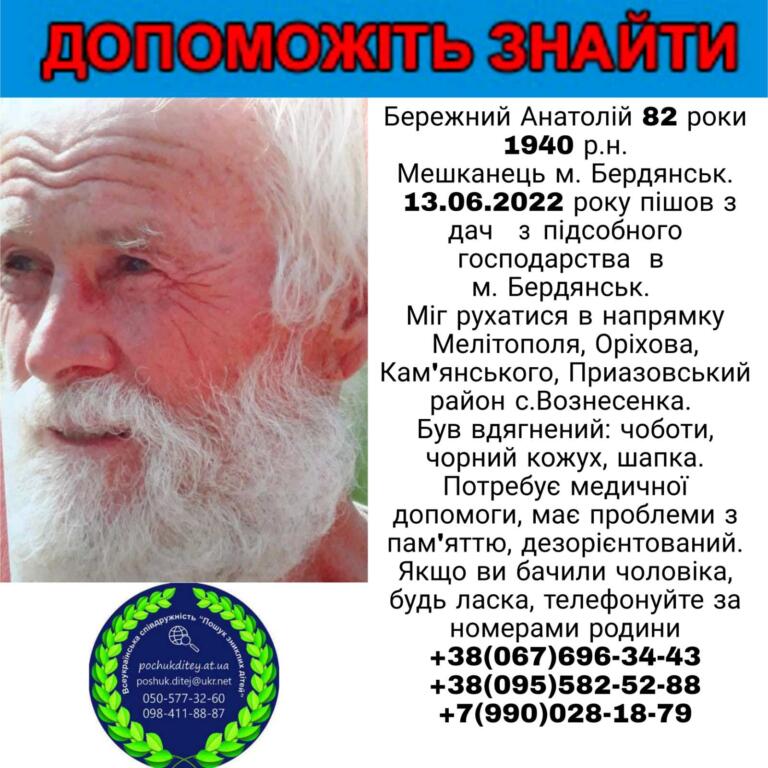Відомо, що Бережний Анатолій 13 червня пішов із дачі, розташованої у Бердянську. Міг прямувати у бік Орєхова, Мелітополя, Кам’янського.