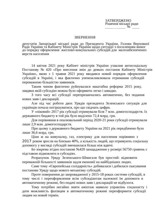 Депутаты Запорожского горсовета напрвят обращение к Президенту Украины, Председателю ВР и Кабмин относительно ситуации с ужесточением требований к порядку оформления жилищно-коммунальных субсидий для малообеспеченных слоев населения.