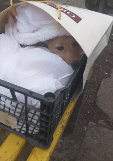 В одном из запорожских пабликов опубликовали видео со странной находкой. На площади Университетской возле танка на парапете стоит обыкновенный пластиковый овощной ящик. Сверху он накрыт картонным пакетом, внутри старое одеяло в которое завернут щенок. На момент публикации данной новости собачку уже забрали неравнодушные люди.