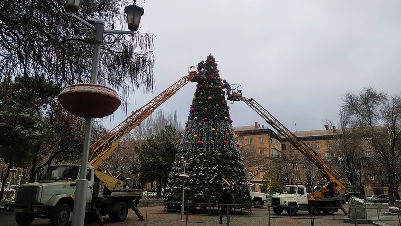 Елку на площади Маяковского начали устанавливать во вторник, 1 декабря. Работники КП «Титан» собрали символ Нового года из металлического каркаса и искусственной зеленой хвои. Сейчас дерево украшают игрушками.