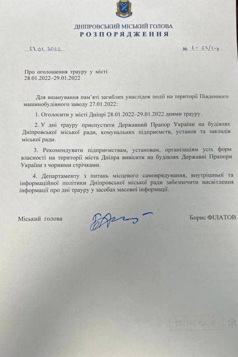 Траур объявлен 28 и 29 января. Такое распоряжение подписал мэр Днепра Борис Филатов.