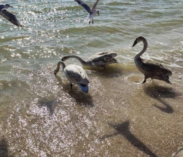 Местные жители запечатлели картину совместной охоты лебедей и чаек, опубликовав снимки в социальной сети.