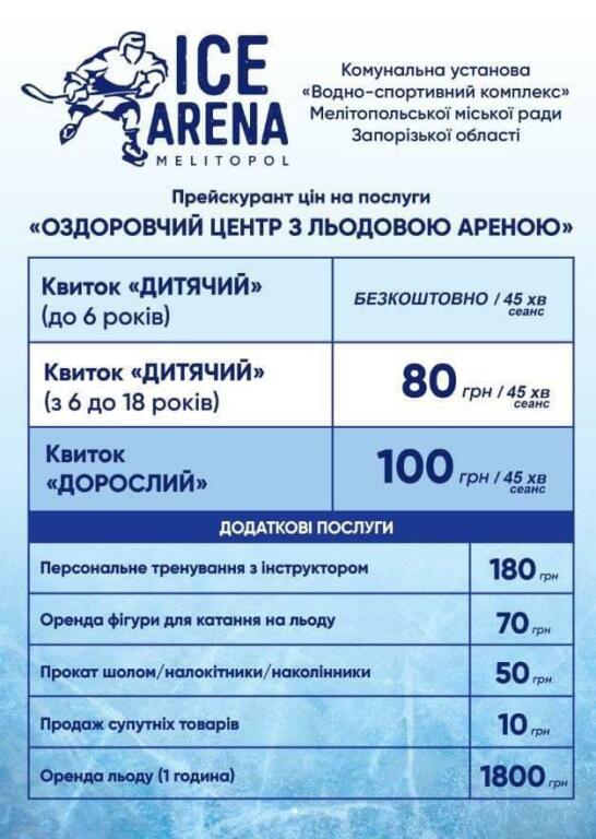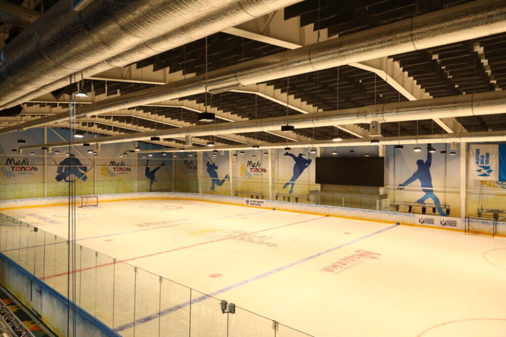 Теперь в Мелитополе появилось место для проведения тренировок, спортивных матчей и выступлений любого уровня. Здесь построена ледовая арена площадью 1800 квадратных метров, вмещающая 120 человек на льду одновременно, большое электронное табло, систему видео-гол и 500 зрительских мест.