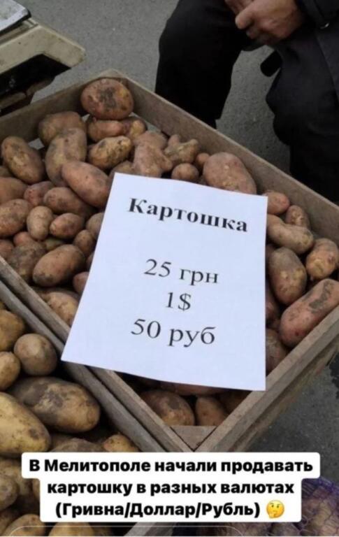 Уже доходит до того, что овощи продают в трех валютах одновременно – на любого платежеспособного покупателя. Так, на рынке запечатлели пенсионерку, которая подстраивалась под новые реалии оккупированного города и продавала картофель в рублях, гривнах и долларах одновременно. Килограмм корнеплода предлагалось купить за 25 грн, 1 доллар или же за 50 рублей. К импровизированному курсу, естественно, возникают вопросы, но, как известно – хозяин-барин.