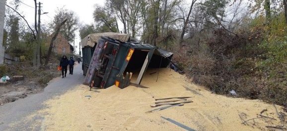 Напомним: В Запорожье на Верхней Хортицеперевернулся грузовик с соей