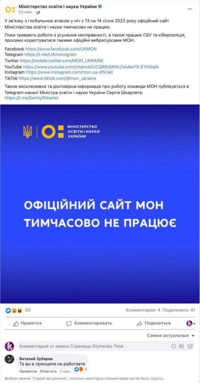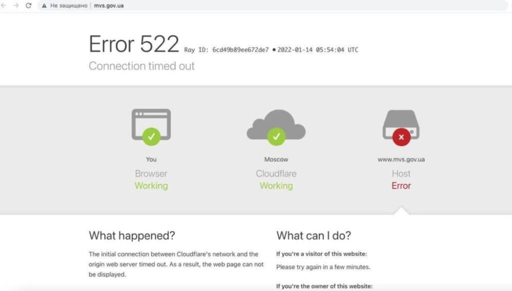 Сегодня, 14 января, ночью на государственные сайты и сайт «Дія» пострадали от рук хакеров. На данный момент не работают сайты Министерства образования, иностранных дел, агро, кабмин, спорта, Минфин, экологии и энергетики. Об этом сообщает канал Украина Сейчас.