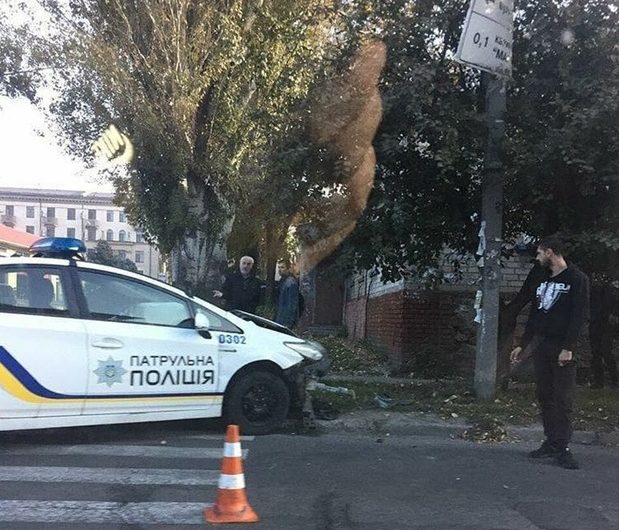 В Запорожье служебный автомобиль патрульной полиции нарушили ПДД и врезался в столб.