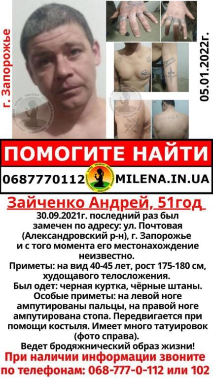 Как сообщает поисково-спасательный отряд “Милена”, последний раз Зайченко Андрея видели 30 сентября прошлого года на ул.Почтовой, что в Александровском районе.