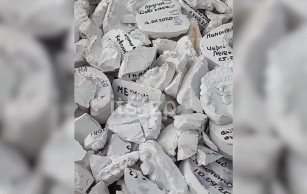 На видео видно сотни слепков челюстей с фамилиями клиентов, которыми и “залатали” яму на дороге. Вероятно, эти слепки принадлежали одной из стоматологических клиник и таким образом решили привлечь внимание к проблеме плохих дорог в городе.