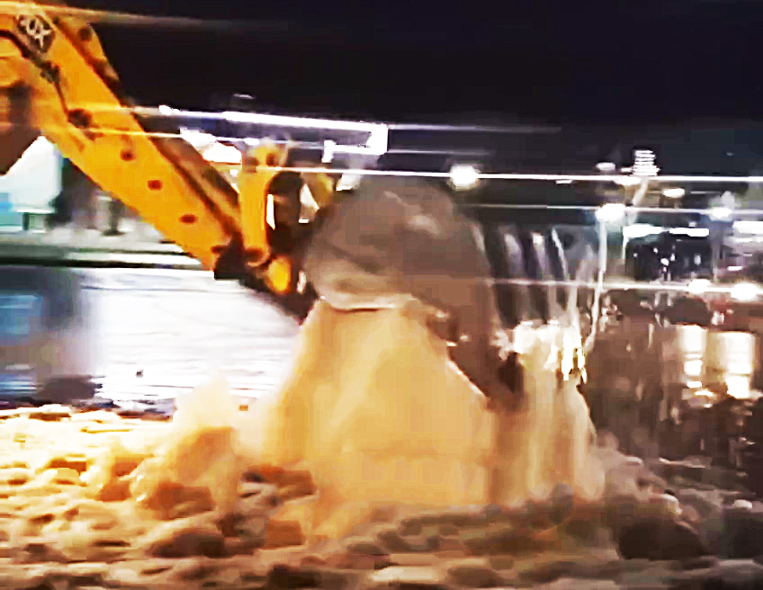 Приехавший на ликвидацию экскаватор пытался ковшом уменьшить напор воды.